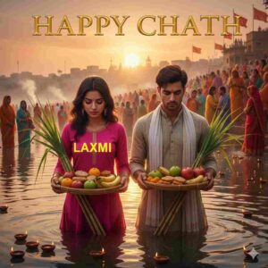 Create a realistic 4K image of an 18-year-old Indian couple standing in the waters of the Ganga Ghat, each holding a soop filled with sugarcanes, fruits, and sweets. The girl wears a pink kurti with her name, “LAXMI,” boldly written in yellow. The couple is shown praying at sunrise, surrounded by the colorful and festive atmosphere of Chhath Puja, with beautifully adorned ghats. In the background, “Happy Chhath” is clearly visible, adding to the celebratory feel.