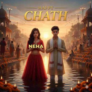 Create a 4K realistic image of a young Indian couple, around 18 years old, standing in the water and praying at sunrise. The girl is dressed in a red lehenga with her name, “NEHA,” clearly written in bold black letters. The scene captures the vibrant spirit of Chhath Puja, with beautifully decorated ghats adding to the festive atmosphere. In the background, “Happy Chhath” should be prominently displayed, enhancing the feeling of celebration and devotion.